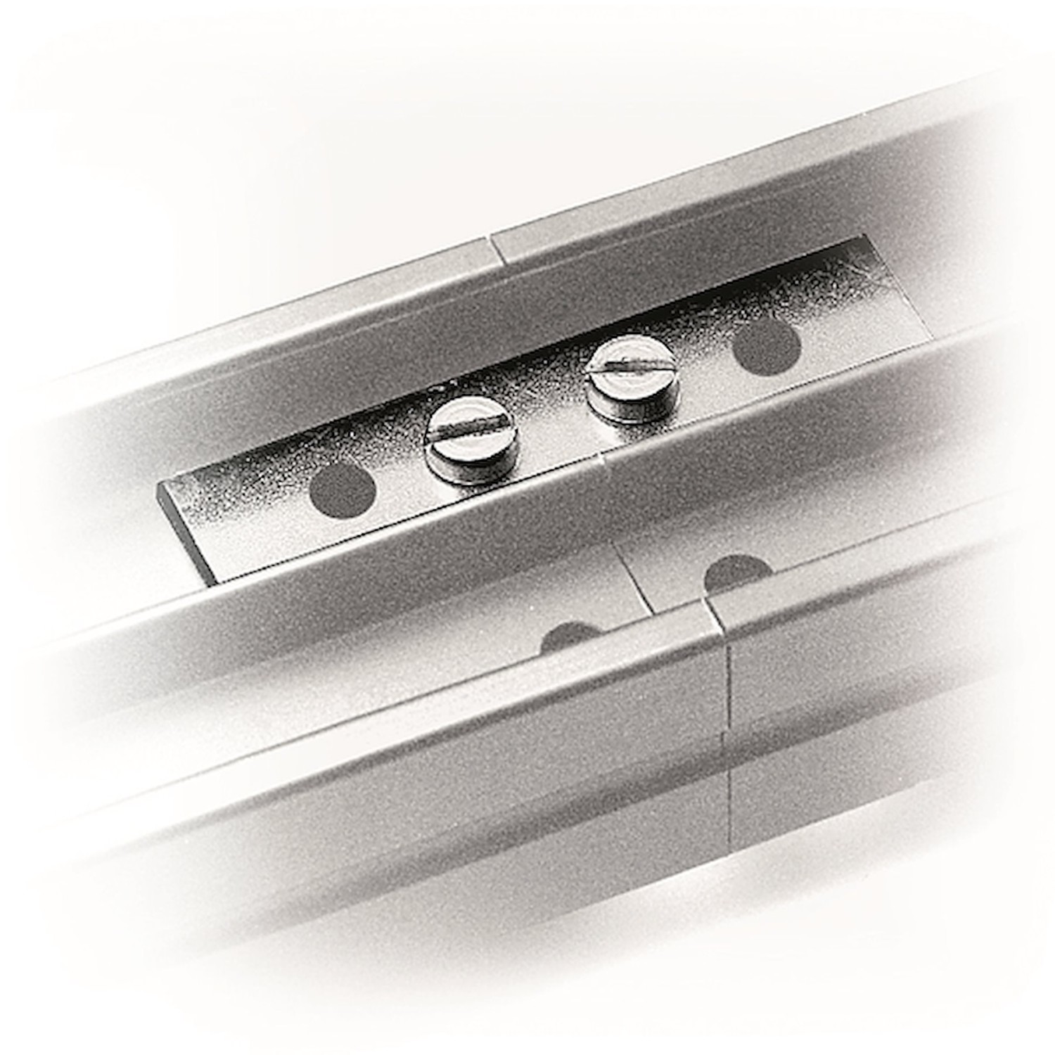Manfrotto FF3208 Rail Connector je 84 g pár hliníkových upínacích desek se šrouby, které spojují dvě pevné kolejnice Sky Track na horní vodicí liště pomocí předvrtaných otvorů – pro bezpečnou a profesionální kontinuitu studiové stropní kolejnice je nutná podpěrná montážní konzola přes spoj.