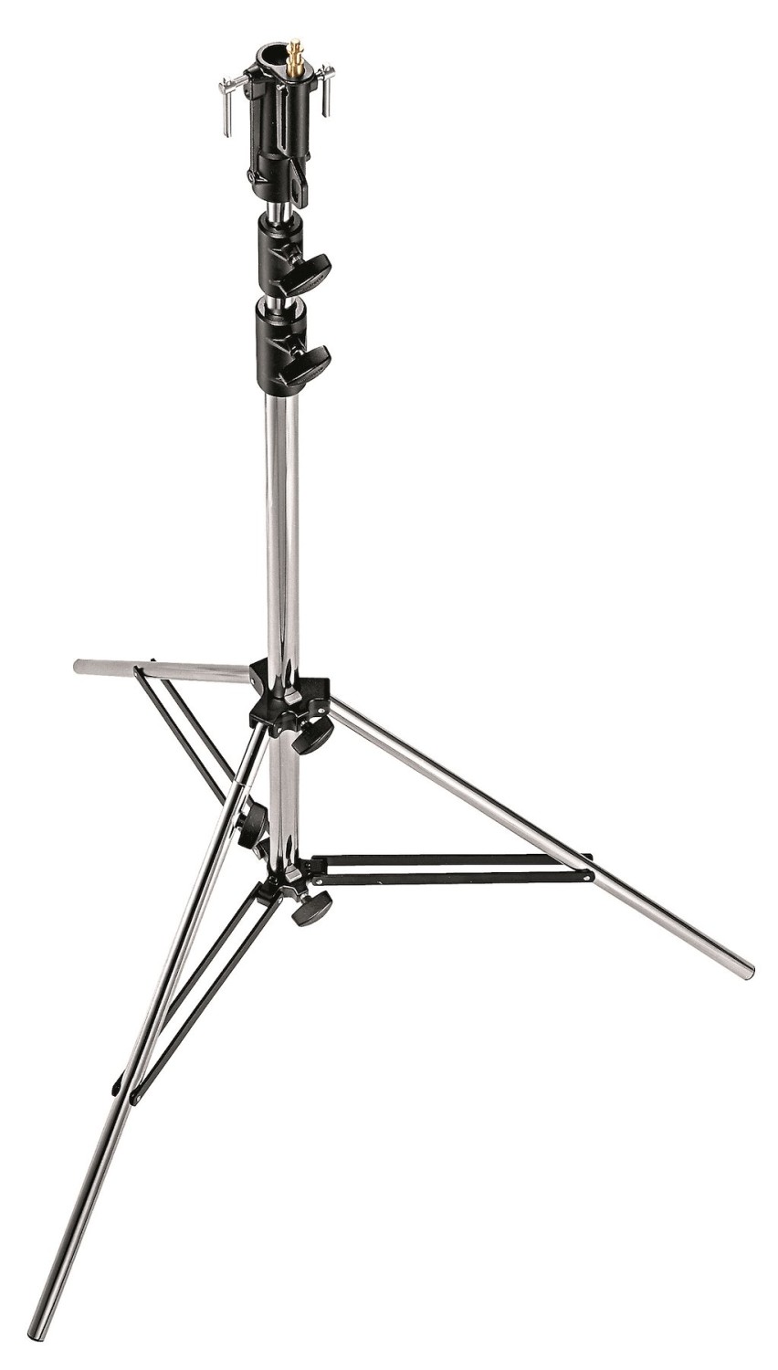 Manfrotto 007CSU Steel Senior Stand je profesionální odolný osvětlovací stojan vyrobený z pochromované oceli, navržený pro maximální stabilitu a bezpečnost při podepírání těžkého osvětlovacího zařízení ve studiu nebo venkovním prostředí.