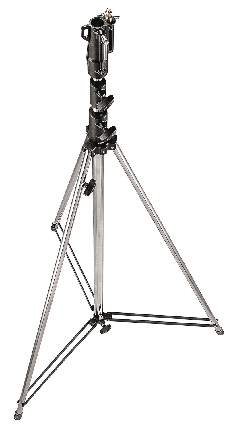 Díky třem sekcím a dvěma výškovým nástavcům se stativ plynule vysouvá ze 146 cm až na impozantních 380 cm, čímž nabízí vynikající výšku a flexibilitu. Dvojité vzpěry nohou zajišťují maximální stabilitu při velkém zatížení, zatímco integrovaná vyrovnávací noha umožňuje přesné nastavení na nerovném nebo drsném terénu. Stativ unese až 25 kg, takže je vhodný pro těžká osvětlovací zařízení, fotoaparáty a profesionální příslušenství.
