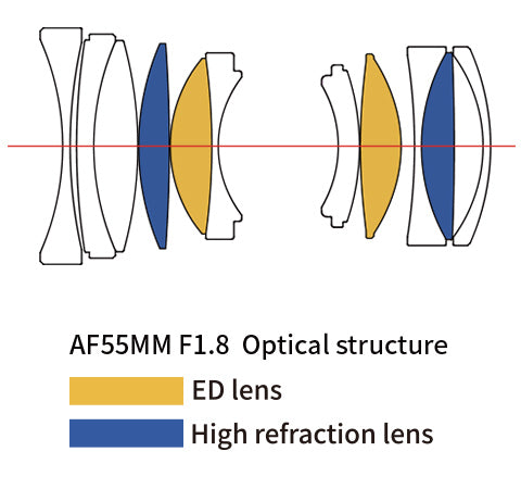 Oboustranná vícevrstvá povrchová úprava objektivu, 2 čočky ED, 2 čočky s vysokou refrakcí, 1 čočka s ultra vysokou refrakcí , účinně kontrolují CA, duchy, odlesky. Nejbližší zaostřovací vzdálenost dosahuje 0,55 m a stejně působivá je i schopnost pořizovat makrosnímky.