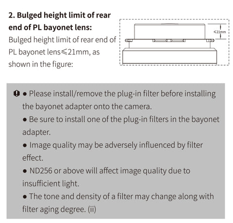 Meike Drop-in Filter Mount Adapter for PL Mount Cine Lens. Standard Package Includes:a drop-in variable neutral density filter (ND3-ND500, equals to 1.5 to 9 stops) and a clear UV filter.