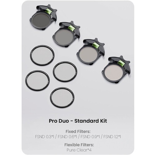 Sada MOFAGE Pro Duo Standard Kit je základním prvkem systému POCO Adapter drop-in, který nabízí profesionální kontrolu neutrální hustoty celého spektra (FSND). Obsahuje čtyři pevné ND filtry (0,3,0,6,0,9, 1,2) pro redukci světla o 1 až 4 clony a čtyři flexibilní filtry Pure Clear pro zachování zaostření bez vlivu na obraz. Celá sada je stohovatelná pro kombinované síly ND až do ND2,4 (8 stupňů).