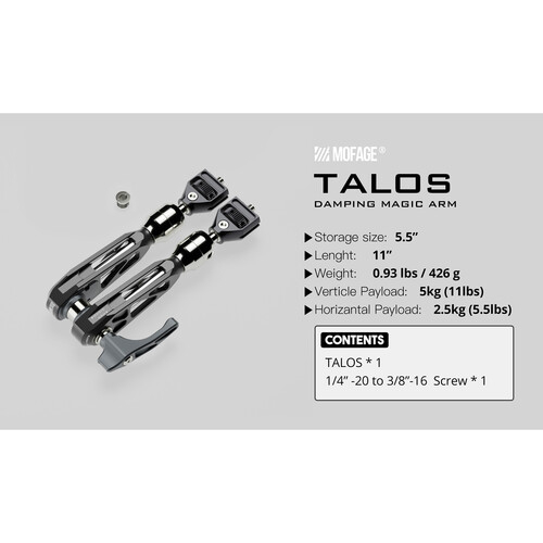 Díky třem bodům kloubu poskytuje rameno Mofage Talos Magic Arm maximální flexibilitu a umožňuje uživatelům snadno pořizovat záběry z různých úhlů. Tento odolný a spolehlivý nástroj je nezbytný pro profesionální produkci, ať už ve studiu nebo na místě.