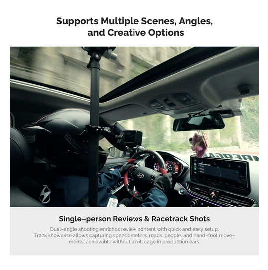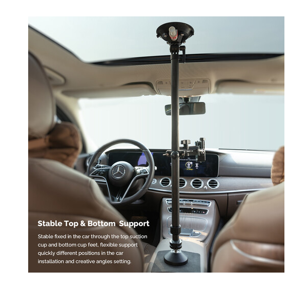 Nastavitelná teleskopická tyč MOVMAX se šroubem 1/4"-20 je lehký, vysoce pevný podpůrný systém z uhlíkových vláken navržený pro bezpečné a bezvibrační upevnění filmové kamery uvnitř vozidel, ideální pro čisté záběry z pohledu první osoby přes čelní sklo. Tyč se plynule nastavuje od 75 do 125 cm pomocí bezpečného otočného zámku a je vhodná pro kompaktní automobily i SUV. Horní přísavka se pevně připevňuje ke sklu střešního okna, zatímco spodní noha se ukotvuje k středové konzole nebo palubní desce, čímž vytváří pevnou trojúhelníkovou konstrukci, která minimalizuje otřesy i při agresivní jízdě. Tato sada obsahuje 1" kulovou hlavu s 1/4"-20 vnějším závitem pro přímé připevnění kamery, 3,9" rameno s dvojitou kulovou objímkou pro plné 360° otáčení a ±90° naklánění a speciální tyčovou svorku s integrovanou kulovou hlavou pro připevnění monitorů, světel nebo sekundárních kamer. Systém je ideální pro automobilovou kinematografii, motoristický sport a vlogování a kombinuje prémiové materiály, přesné kloubové spojení a spolehlivé vakuové přilnutí pro profesionální stabilitu v autě.