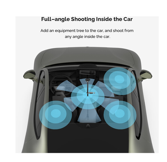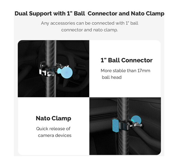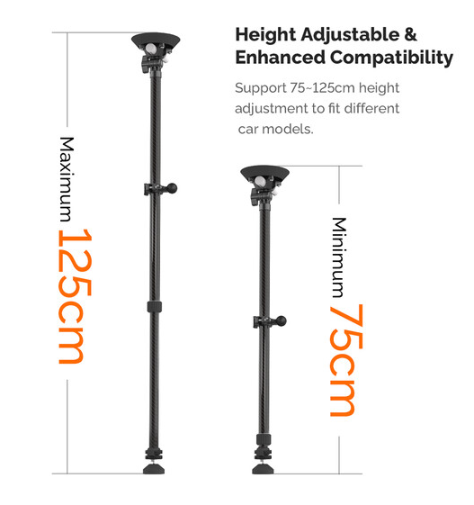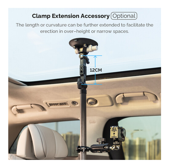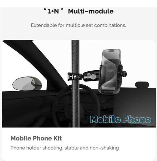 Nastavitelná teleskopická tyč MOVMAX se šroubem 1/4"-20 umožňuje stabilní natáčení z čelního skla automobilu, lze ji vysunout z 75 na 125 cm, je vyrobena z uhlíkových vláken, má dvojité přísavky pro upevnění na střešní okno a středovou konzoli a je dodávána s kulovou hlavou 1/4"-20, dvojitým ramenem a svorkou s kulovou hlavou pro plně kloubové nastavení polohy kamery.