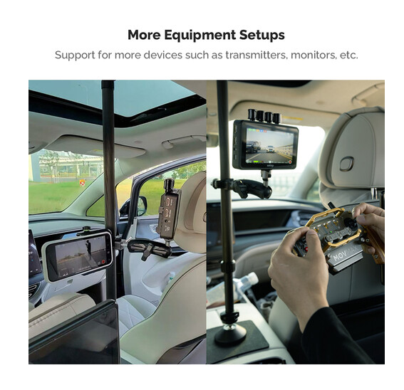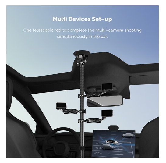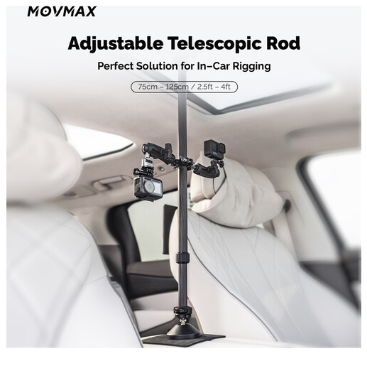 Nastavitelná teleskopická tyč MOVMAX s tříbodovým držákem umožňuje bezpečné natáčení akční kamerou v autě přes čelní sklo. Její délka se dá nastavit od 2,5 do 4 stop a má dva přísavné držáky pro střešní okno a středovou konzoli. Součástí balení je také tříbodový adaptér s kulovou hlavou, dvojité rameno a svěrka s kulovou hlavou pro univerzální umístění.