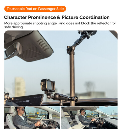 Nastavitelná teleskopická tyč MOVMAX s tříbodovým držákem je profesionální systém pro upevnění kamery ve vozidle, který je navržen pro čisté záběry z pohledu první osoby bez vibrací přes čelní sklo vozidla pomocí akčních kamer, jako je GoPro. Robustní hliníková teleskopická tyč se plynule nastavuje od 76 do 122 cm, aby se přizpůsobila různým velikostem kabiny, a bezpečně se aretuje v jakékoli délce. Horní konec je vybaven vysoce pevnou přísavkou, která se spolehlivě připevní k střešnímu oknu nebo sklu stropu, zatímco spodní přísavka se pevně ukotví k středové konzole nebo palubní desce a zajistí tak pevnou stabilitu při jízdě vysokou rychlostí nebo v terénu. Tato sada obsahuje kompletní sadu kloubů: tříbodový držák ve stylu GoPro s integrovanou kulovou hlavou, rameno s dvojitou kulovou hlavou pro otáčení a naklánění o 360° a speciální tyčovou svorku s kulovou hlavou pro připevnění sekundárních zařízení nebo jemné doladění úhlů. Systém je ideální pro tvůrce automobilového obsahu, filmaře motoristického sportu a vlogery a nabízí flexibilní umístění kamery bez použití rukou s minimálním omezením interiéru a maximální kreativní kontrolou.