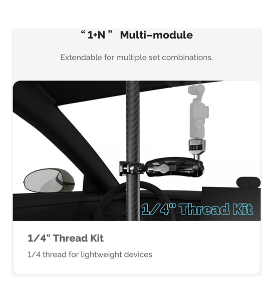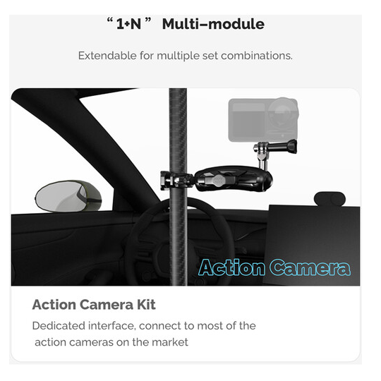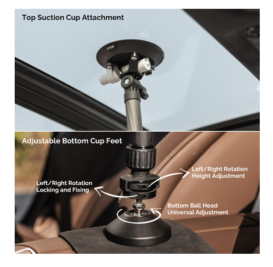 Nastavitelná teleskopická tyč MOVMAX s držákem na smartphone představuje profesionální řešení pro pořizování plynulých a vysoce kvalitních záběrů z pohledu první osoby přes čelní sklo vozidla pomocí smartphonů nebo kompaktních mobilních zařízení. Tyč je vyrobena z prvotřídního uhlíkového vlákna a pomocí bezpečného otočného uzamykacího systému se plynule vysouvá z 75 na 125 cm, čímž se přizpůsobí různým interiérům vozidel od sedanů po SUV. Horní přísavka se spolehlivě připevní ke sklu střešního okna, zatímco spodní noha se upevní k středové konzole nebo palubní desce a vytvoří pevný rám odolný proti vibracím, který je ideální pro jízdu vysokou rychlostí nebo v terénu. Tato sada obsahuje pružinovou svorku na smartphone s integrovanou 1" kulovou hlavou (vhodná pro zařízení o šířce 2,2–3,5"), 3,9" rameno s dvojitou kulovou hlavou pro 360° otáčení a plnou kontrolu naklonění a tyčovou svorku s kulovou hlavou pro připevnění sekundárního příslušenství, jako jsou světla nebo mikrofony. Systém je ideální pro vlogery, recenzenty automobilů a mobilní filmaře a zajišťuje přesné rámování, minimální otřesy a maximální kreativní flexibilitu v dynamických podmínkách natáčení v autě.