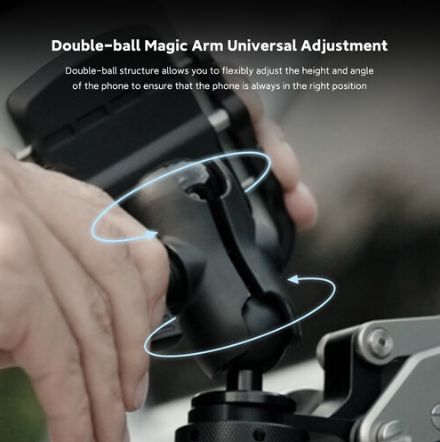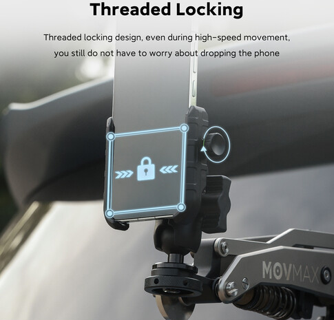 Držák MOVMAX Smartphone Clamp (86-0039) upevňuje telefony o velikosti 2,4 až 3,5 palce na rameno Blade Arm s kulovou hlavou 1/4"-20 pro plné vertikální/horizontální nastavení, obsahuje Bluetooth dálkové ovládání pro spouštění fotoaparátu/kamery v autě a používá silikonové polstrování, aby zařízení zůstala bez škrábanců a stabilní během vlogů z vozidel s vysokou rychlostí.