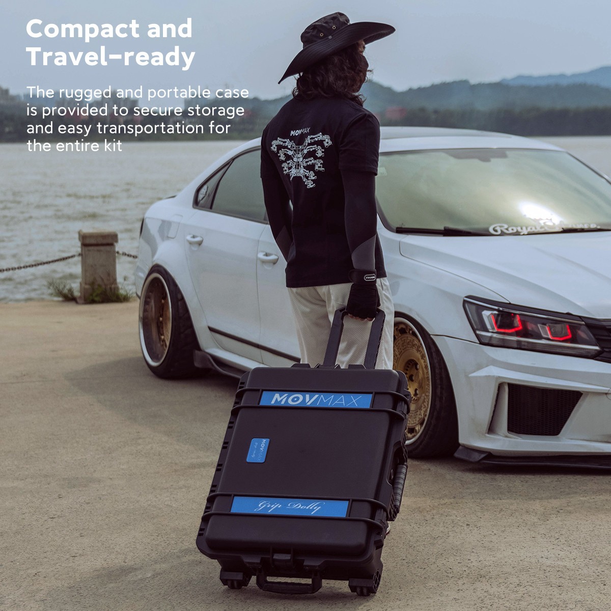 Sada MOVMAX Grip Dolly Pro Kit je odolný vozík s nosností 198 liber. Obsahuje plochou desku, kulové adaptéry 75/100/150 mm, adaptér Mitchell a polymerová kolečka pro stabilní pohyb. Vozík je vybaven několika závity 1/4"-20 a 3/8"-16, středovými a bočními podpěrami a je dodáván s přepravním kufrem pro snadnou přepravu a skladování.