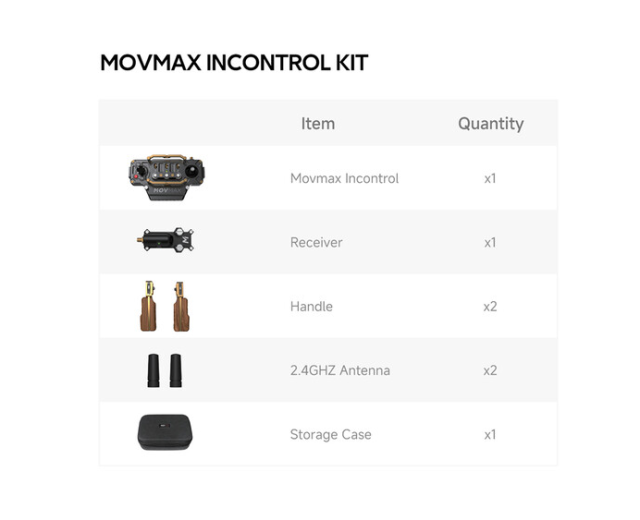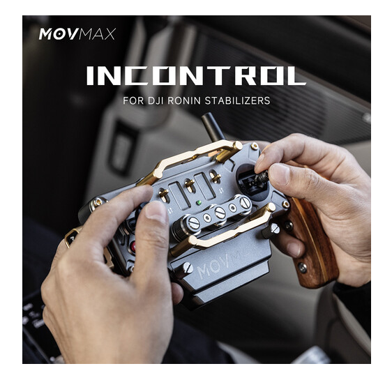 Bezdrátový ovladač MOVMAX Incontrol pro DJI Ronin poskytuje přesné a přizpůsobitelné ovládání gimbalu až do vzdálenosti 150 m (492') přes 2,4 GHz, s nastavitelnými tříosými rychlostmi/zónami, centrováním jedním kliknutím, spouští REC, teleskopickými joysticky z uhlíkových vláken, odnímatelnými dřevěnými rukojeťmi a vyměnitelnou baterií 3350 mAh 18650 s výdrží až 15 hodin; plně kompatibilní s DJI RS 4 Pro, RS 4, RS 3 Pro a RS 2 (nikoli RS 3).