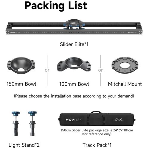 MOVMAX Slider Elite s 150mm miskovým držákem (1,5 m) zajišťuje plynulé, profesionální posuvné záběry díky odolným hliníkovým kolejnicím a systému založenému na tření. S 150mm miskovým držákem, nosností 55 lb a univerzálními možnostmi upevnění je ideální pro velké kamery a natáčení v terénu. Balení obsahuje přepravní kufr a adaptéry na světelný stojan pro pohodlnou přepravu a instalaci.