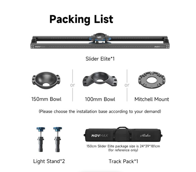 MOVMAX Camera Slider Elite 82" s Mitchellovým uchycením je profesionální manuální kamerový slider pro těžké použití s hliníkovými kolejnicemi o délce 82,6" a třecím posuvným systémem pro ultra hladké a tiché snímání. Je navržen pro střední až velké filmové kamery a jeho integrovaný posuvný vozík zahrnuje ploché uchycení Mitchell, zatímco ovládací knoflíky brzdy a tlumiče umožňují přesné nastavení odporu. Slider unese až 25 kg a je dodáván se dvěma adaptéry pro světelné stojany (5/8" přijímače) pro snadnou montáž na C-stojany nebo světelné stojany, plus přepravní kufr pro transport.