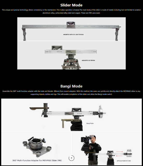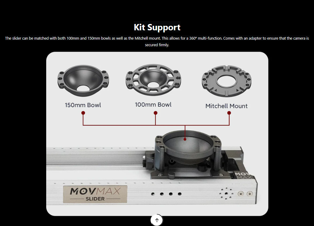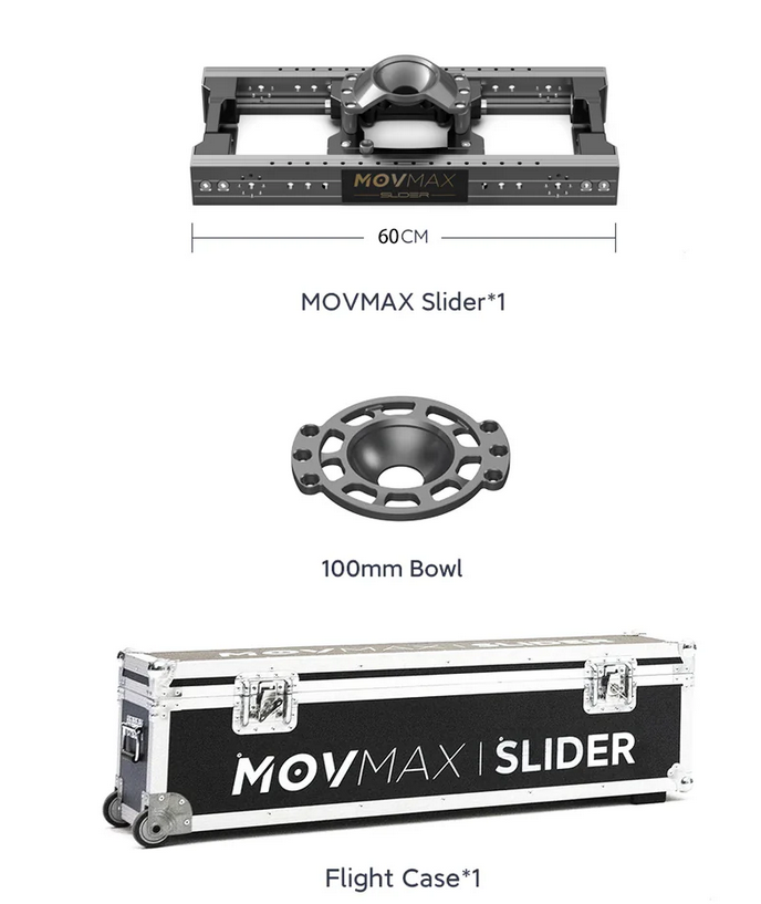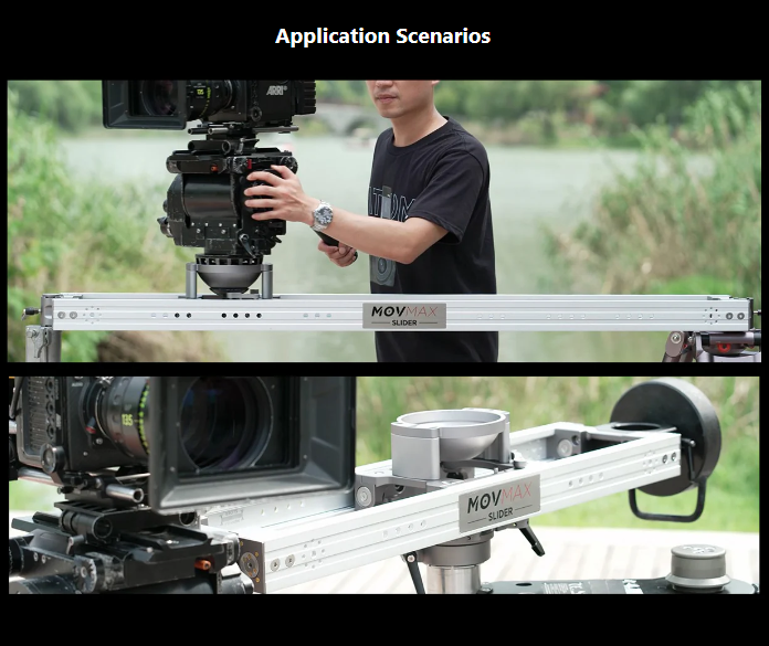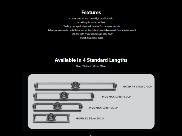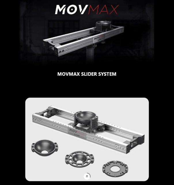 Systém MOVMAX Slider je precizně konstruovaný kamerový slider určený pro profesionální kinematografii, který je k dispozici v délkách 60 cm, 90 cm, 120 cm, 150 cm, 180 cm a 210 cm. Je vybaven tichými, hladkými a vysoce přesnými kolejnicemi, režimem bočního rozšiřování pro použití se stativy nebo světelnými stojany a kompatibilitou s 100 mm/150 mm miskovými úchyty nebo úchyty Mitchell, vše postavené na robustním těle z hliníkové slitiny řady 7.