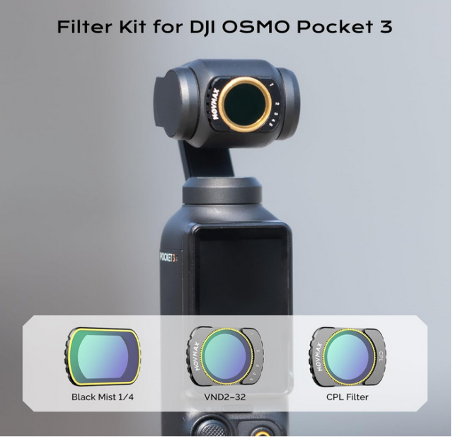 Sada magnetických filtrů MOVMAX pro DJI Osmo Pocket 3 Creator Combo obsahuje variabilní filtr ND2-32 (1–5 clonových stupňů), otočný filtr CPL a difuzní filtr Black Mist 1/4 – všechny se magnetickým uchycením pro okamžité použití – plus ochrannou fólii na LCD displej, které zajišťují filmovou kontrolu, jas bez odlesků…
