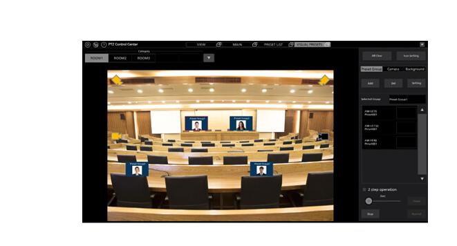 Software také podporuje vytváření skupin předvoleb a vizuálních rozvržení natáčecích prostředí, což umožňuje konfigurace více místností a rychlé přepínání mezi nastaveními. Polohy kamer jsou zobrazeny jako ikony a aktivní kamery jsou zvýrazněny, což operátorům poskytuje okamžitou vizuální zpětnou vazbu. Díky systému ovládání pomocí myši je přístupný i pro uživatele s omezenými technickými zkušenostmi.