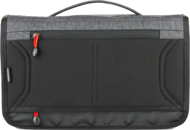 Na zadní straně tašky je ve spodní části kapsa na zip, kterou lze otevřít a protáhnout rukojetí na kolečkách, což je praktické při cestování