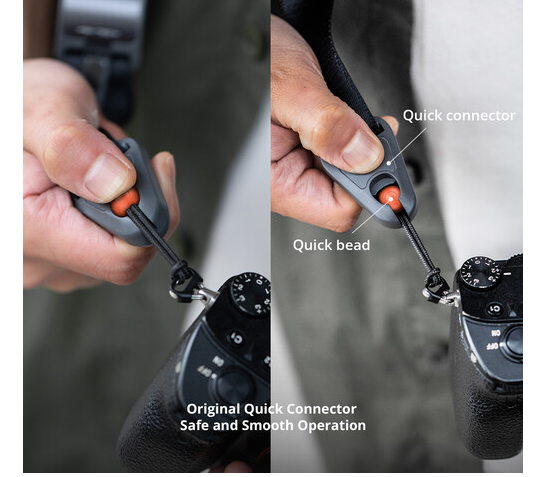 Každý popruh je vybaven rychloupínacím konektorem a magnetickým uzamykacím systémem, který popruhy zajišťuje, když se nepoužívají. Smyčka konektoru je vyrobena ze tří vrstev UHMWPE, včetně odolné vnější vrstvy, vnitřní vrstvy s varováním o nutnosti výměny a nosného jádra, které bezpečně unese až 198 lb. Rychlé nastavovače délky vám umožňují doladit popruh během několika sekund pouze jednou rukou, takže můžete snadno nosit fotoaparát v ideální výšce.