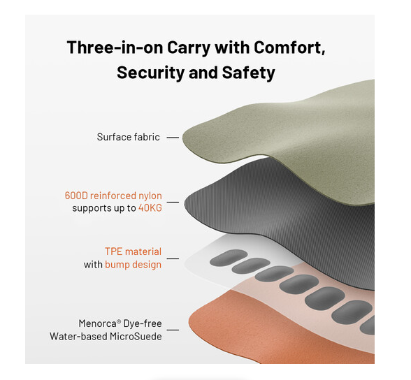 Podšívka z TPE s protiskluzovým designem zvyšuje pohodlí při delším používání a zabraňuje namáhání krku nebo ramen. Tento popruh je lehký, váží pouhých 70 g, je vyroben z prodyšného ekologického vyztuženého nylonu 600D a má stylovou povrchovou úpravu Earth Brown. Kombinuje bezpečnost, pohodlí a estetiku pro fotografy na cestách.