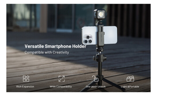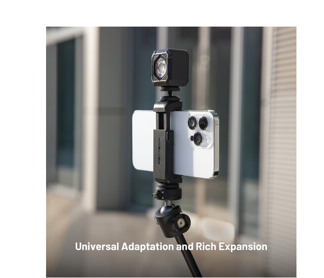 Univerzální držák na smartphone je vhodný pro telefony o šířce 2,4 až 3,6 palce, má silikonová těsnění, která chrání vaše zařízení, a obsahuje držák pro příslušenství. Jeho odemykání jedním stisknutím a 1/4"-20 vnitřní závit umožňují rychlé nastavení a kompatibilitu se stativem. Díky prémiové konstrukci z hliníku, oceli a odolných plastů zajišťuje tato kombinace pohodlí a spolehlivost při natáčení na cestách.