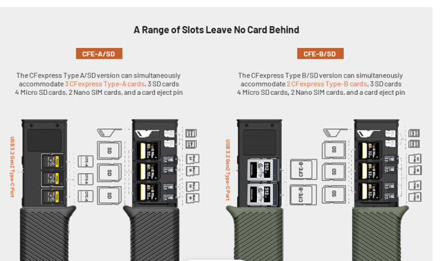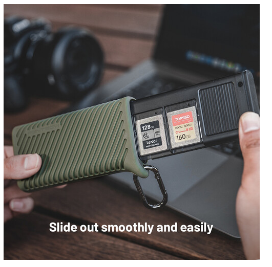Uloží až 12 karet: 3 CFexpress typu A, 3 SD, 4 microSD, 2 Nano SIM