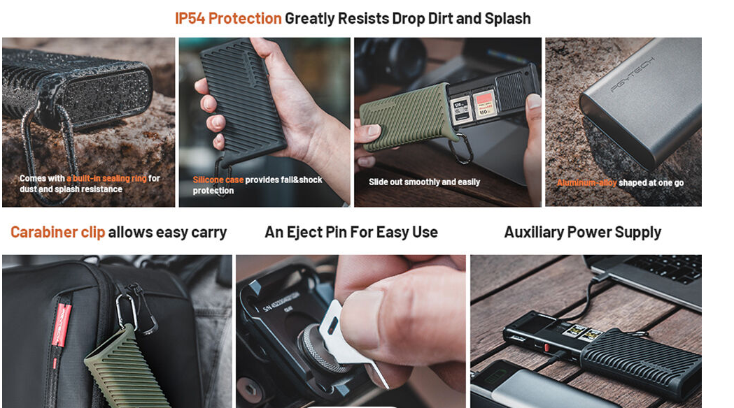 Hliníkové pouzdro s krytím IP54, silikonovou ochranou a těsnicím kroužkem chrání před pády, prachem a postříkáním, zatímco karabina umožňuje snadné připevnění k taškám. Pomocný napájecí port USB-C (5 V/2 A) zajišťuje stabilní přenos dat. Kompatibilita plug-and-play se vztahuje na zařízení se systémy Windows, macOS, Linux, Android a iPadOS, což usnadňuje přenos dat z fotoaparátů, dronů nebo akčních kamer do vašich zařízení. Kompaktní, lehké a vysoce odolné pouzdro na čtečku karet je univerzálním řešením pro správu médií na cestách.