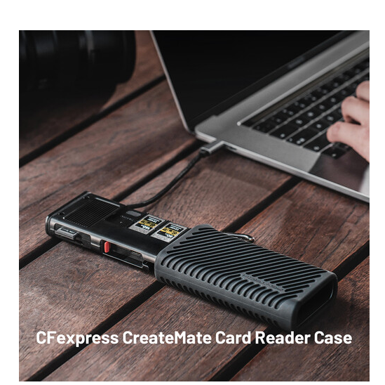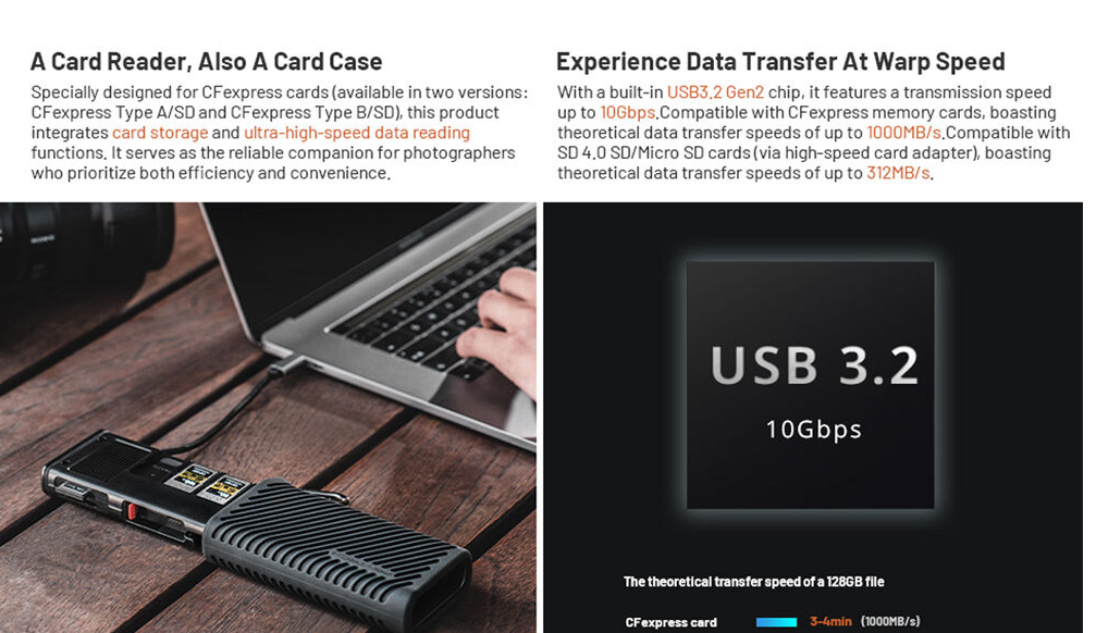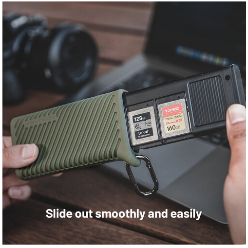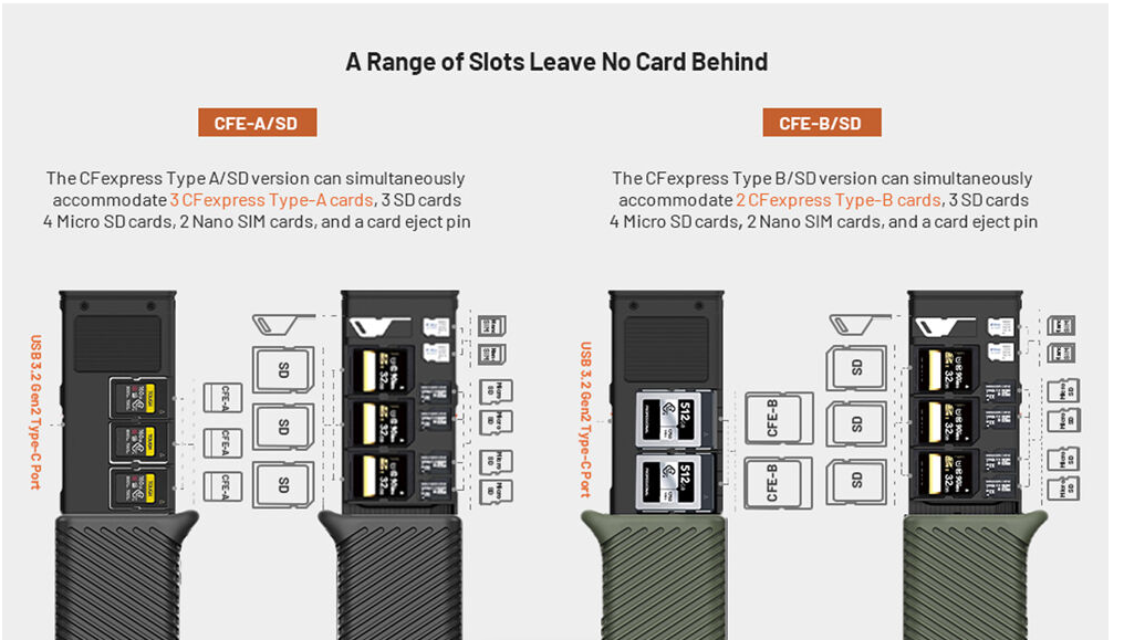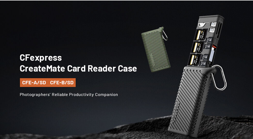 Dva sloty pro karty umožňují čtení karet CFexpress typu B a UHS-II SD (jedna po druhé), zatímco přiložený adaptér microSD na SD zvyšuje univerzálnost. Pomocný napájecí port USB-C (5 V/2 A) zajišťuje stabilní a konzistentní přenos dat, zatímco konstrukce s krytím IP54 chrání před prachem, nečistotami a stříkající vodou. Pouzdro je také vybaveno karabinou pro snadné připevnění k tašce nebo popruhu a multifunkčním vyhazovacím kolíkem pro snadné vyjmutí karty. Jeho kompatibilita plug-and-play zahrnuje Windows 7+, macOS 10.6+, Linux, Android a iPadOS, což z něj činí ideálního společníka pro fotoaparáty, drony, akční kamery a smartphony.