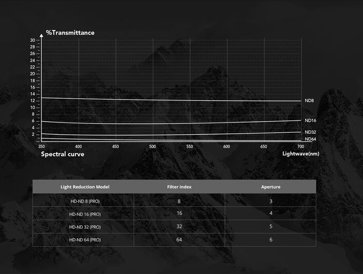 Čtyři ND filtry: ND8 (3 clony), ND16 (4 clony), ND32 (5 clon), ND64 (6 clon)