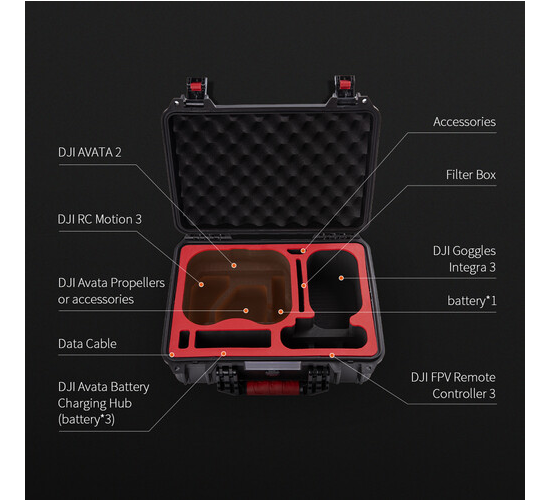 Uvnitř pouzdra je přesná vložka z EVA pěny, která chrání a zajišťuje váš dron, RC Motion 3, brýle Integra 3, dálkový ovladač FPV 3, bateriový hub Avata s až třemi nainstalovanými letovými bateriemi, čtvrtou letovou baterii, filtry, vrtule, datové kabely a další nezbytné příslušenství. Víko je vybaveno dodatečným polstrováním a protiskluzová, odolná rukojeť usnadňuje přepravu. Dodatečnou bezpečnost zajišťují dva otvory pro visací zámek a automatický ventil pro uvolnění tlaku chrání vaše vybavení před změnami tlaku během přepravy. Tento kufr je ideální pro outdoorové dobrodružství a cestování a zajišťuje, že vaše FPV vybavení zůstane v bezpečí a připravené k akci.