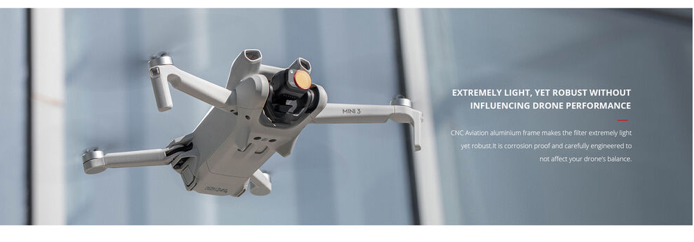 Filtr je vyroben z japonského optického skla AGC s dvojitou vrstvou a zajišťuje minimální lom světla a výjimečnou optickou čistotu. Lehký, ale robustní rám z hliníku CNC je odolný proti korozi a navržen tak, aby udržoval rovnováhu dronu během letu. Díky oboustranné vrstvě je vodotěsný, odolný proti oleji a poškrábání, což zajišťuje jeho odolnost a dlouhodobý výkon. S redukcí světla o 1 stupeň umožňuje kontrolovanou expozici za jasných podmínek.