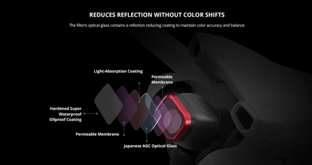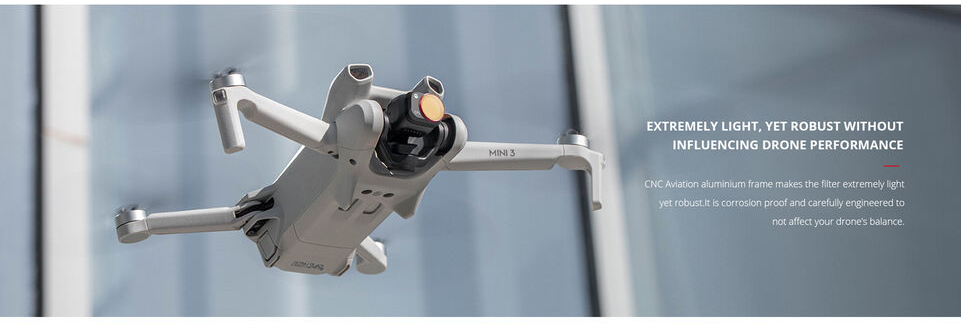 Každý filtr je vyroben z precizně broušeného japonského optického skla AGC s nízkým indexem lomu, aby byla zajištěna přesná reprodukce barev a vysoké rozlišení obrazu. Oboustranné vícevrstvé povlaky zajišťují odolnost proti vodě, oleji a poškrábání, díky čemuž jsou spolehlivé pro venkovní a letecké použití. Lehký, ale robustní hliníkový rám CNC je odolný proti korozi a je navržen tak, aby udržoval správnou rovnováhu závěsu a zajišťoval stabilní letové vlastnosti.