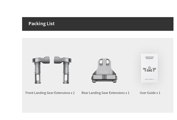 Díky rychlému uvolnění a skládací konstrukci mohou být prodloužení připevněna i při skládání dronu pro skladování nebo přepravu. Silikonové podložky pohlcující nárazy na spodní straně každé nohy snižují síly nárazu při přistání, zvyšují bezpečnost a chrání citlivé součásti dronu. Tato prodloužení podvozku, která se snadno instalují a odstraňují, jsou nezbytným příslušenstvím pro každého pilota Mini 3 Pro, který chce rozšířit své možnosti přistání a chránit svůj dron.