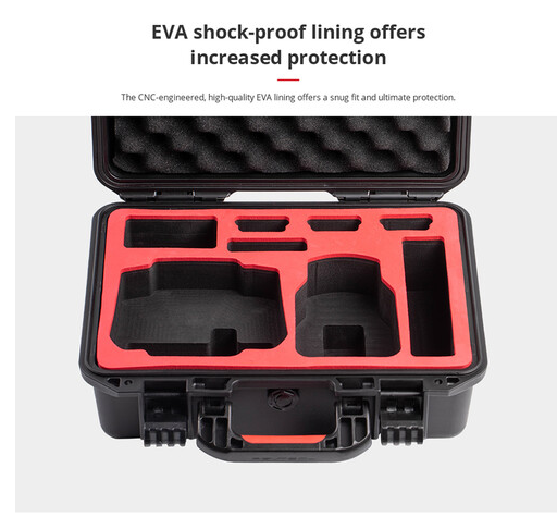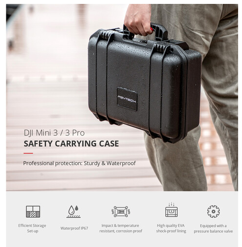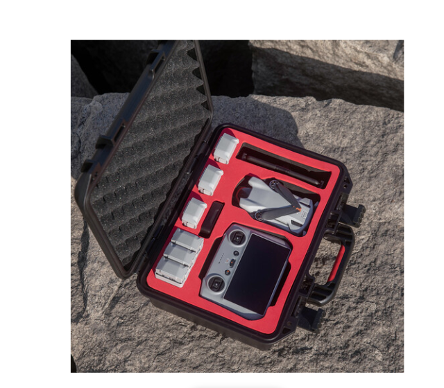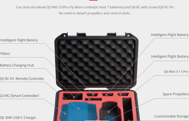 Uvnitř je přesná pěnová vložka a pěnové víko, které bezpečně drží složený DJI Mini 3 nebo Mini 3 Pro, dálkové ovládání DJI RC nebo RC-N1, až sedm baterií (včetně jedné v dronu), nabíjecí hub, filtry, kabely a náhradní vrtule. Dvojité uzavírání zajišťuje těsné uzavření, zatímco automatický ventil pro uvolnění tlaku vyrovnává vnitřní tlak během letecké přepravy. Další funkce, jako je sklopná rukojeť pro přenášení a otvory pro visací zámek z nerezové oceli, zvyšují přenosnost a bezpečnost.