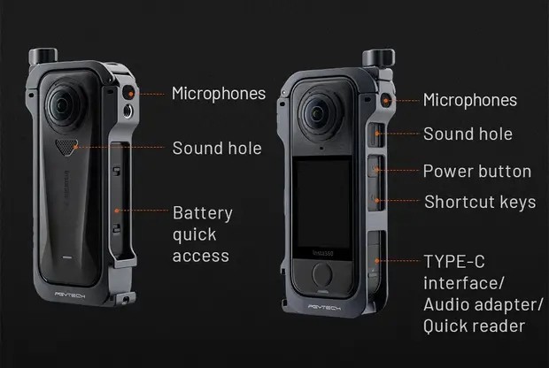 Přes pevný rám zůstávají všechny ovládací prvky, porty i spodní rychloupínací 1/4"-20 závit plně dostupné a kompatibilní s originálním systémem Insta360. Klec je navržena tak, aby neovlivňovala kvalitu signálu, přenos dat ani použití externího mikrofonu.