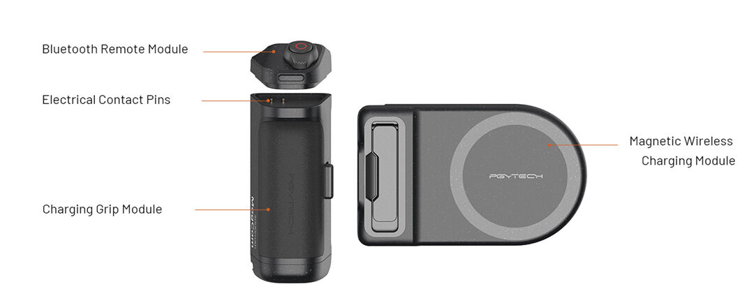 Jeho modulární design promění držák ve stabilní stojan pro prohlížení nebo nahrávání bez použití rukou. Odnímatelný multifunkční modul spouště se připojuje bezdrátově přes Bluetooth a lze jej použít jako dálkové ovládání ze vzdálenosti až 10 metrů, což vám umožní pořizovat fotografie, spouštět nebo zastavovat video, zoomovat a upravovat nastavení, aniž byste se dotýkali telefonu (funkce se liší podle zařízení a operačního systému).
