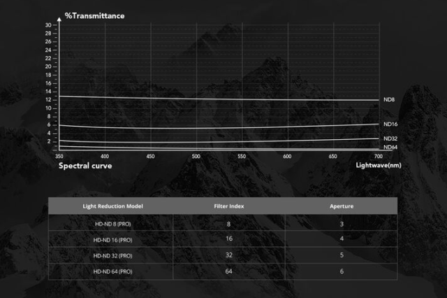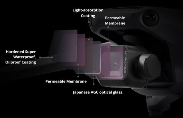 Každý filtr je vyroben z japonského optického skla AGC s dvojitou vrstvou, broušený a leštěný pro nízký index lomu, což zajišťuje přesnou reprodukci barev a ostrý obraz jak pro fotografie, tak pro video. Vodotěsné, oleji odolné a odolné proti poškrábání povlaky chrání sklo v náročných letových podmínkách. Filtry jsou uloženy v lehkém hliníkovém rámu opracovaném na CNC strojích, jsou odolné proti korozi a přesně konstruované tak, aby během letu udržovaly správnou rovnováhu závěsu.
