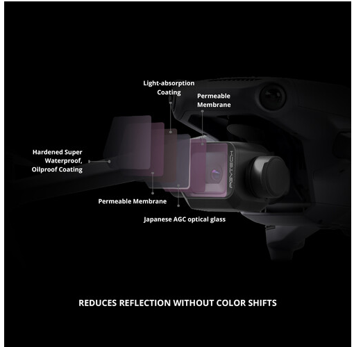 Filtr je vyroben z prvotřídního japonského optického skla AGC a je opatřen oboustrannou vícevrstvou povrchovou úpravou, která je voděodolná, odolná proti oleji a poškrábání, což zajišťuje jeho odolnost v náročných venkovních podmínkách. Přesný hliníkový rám opracovaný na CNC strojích je lehký, odolný proti korozi a navržen tak, aby neovlivňoval kalibraci závěsu ani vyvážení letu. Díky tomu je spolehlivým řešením pro každodenní ochranu objektivu pro profesionální letecké fotografy a kameramany.