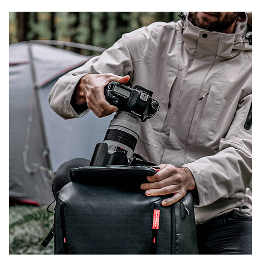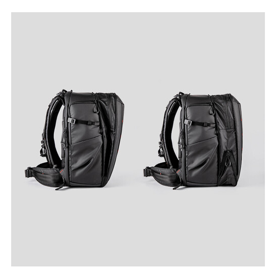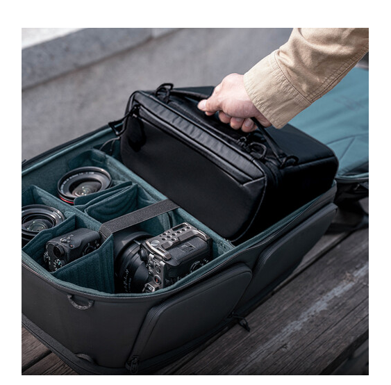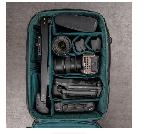 Jeho vědecky strukturovaný interiér je vybaven silnými, flexibilními přepážkami na suchý zip, které bezpečně organizují těla fotoaparátů, objektivy, drony a osobní věci. Vylepšená přední přihrádka podporuje rozšíření ve tvaru V a H, takže snadno pojme stabilizátory gimbalu a větší příslušenství. Široké zadní otvírání umožňuje ploché balení pro rychlé nastavení a efektivní přístup, zatímco rychlý přístup shora a z pravé strany vám umožní vytáhnout objektivy s dlouhým ohniskem, aniž byste museli tašku sundávat.