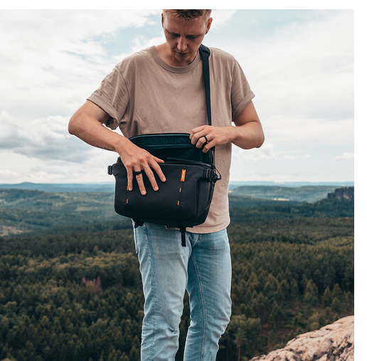 Pohodlí zajišťuje tlustý, široký, prodyšný polstrovaný ramenní popruh, zatímco spodní popruh na stativ a popruhy umožňují připevnit stativy, klipy na fotoaparát nebo karabiny. Taška OneMo Sling je vyrobena z voděodolných materiálů s odolnými zipy a pro větší bezpečnost je vybavena skrytou kapsou na AirTag, což z ní dělá vynikajícího společníka na cesty, pouliční fotografování nebo každodenní dobrodružství.