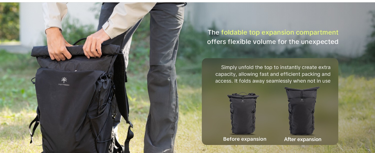 ○ Jednoduše rozložte horní část a okamžitě získáte další úložný prostor, který umožňuje rychlé a efektivní balení a přístup. Když jej nepoužíváte, lze jej snadno složit.