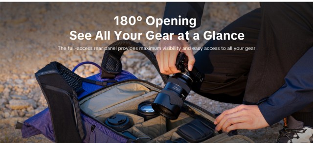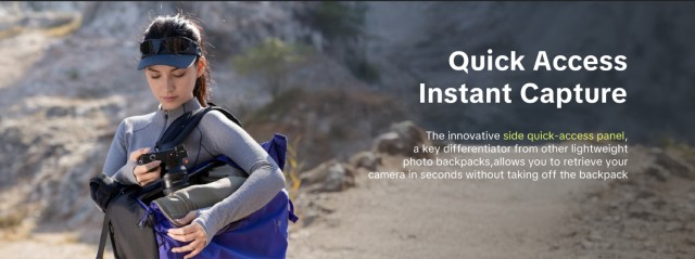 Inovativní boční panel pro rychlý přístup, který je klíčovým rozdílem oproti jiným lehkým fotografickým batohům, vám umožní vyndat fotoaparát během několika sekund, aniž byste museli batoh sundávat.