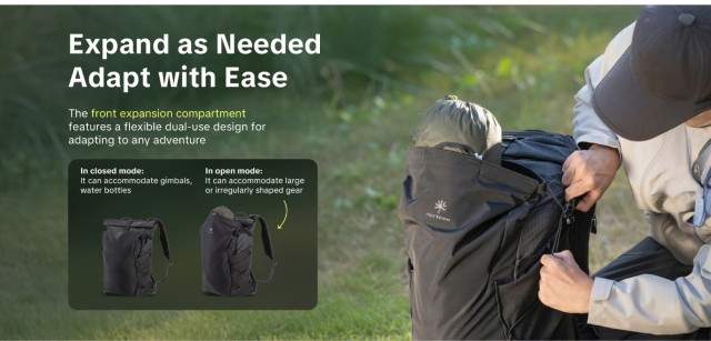 Přední rozšiřující se přihrádka má flexibilní design s dvojím použitím, který se přizpůsobí jakémukoli dobrodružství.