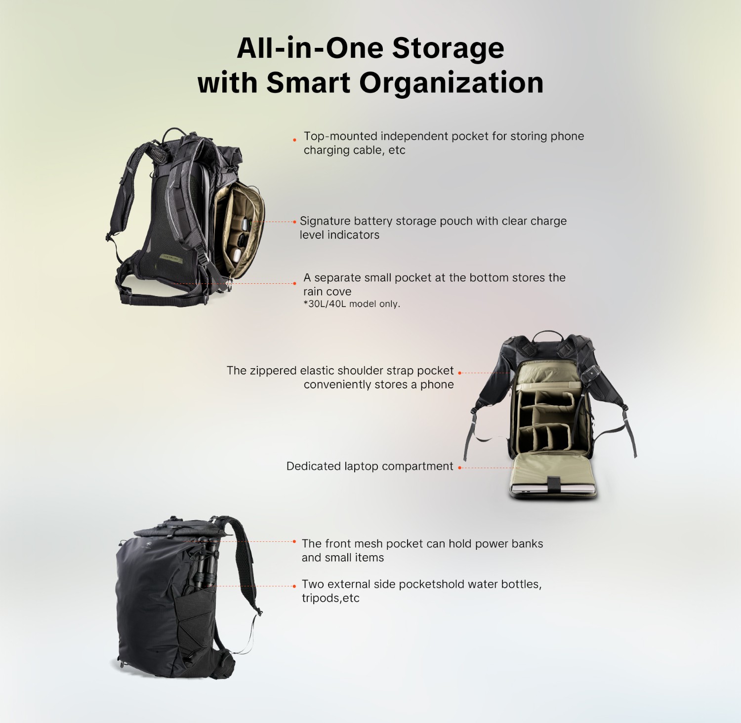 ○ V uzavřeném režimu: Tvoří bezpečné, oddělené úložné prostory pro kompaktní gimbaly, láhve na vodu a další drobné předměty.