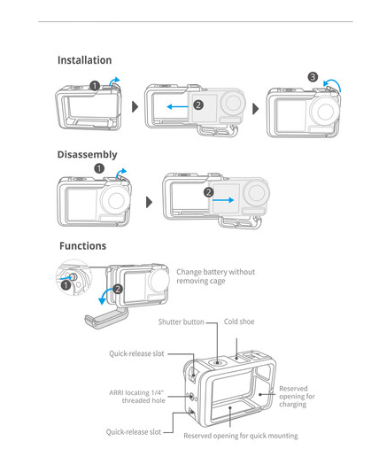 Kryt je vybaven odklápěcím víkem pro přístup k USB-C napájení nebo nabíjení bez nutnosti sejmutí kamery, což umožňuje nepřetržitý provoz během dlouhých natáčení. Pro připevnění příslušenství obsahuje jednu horní studené patky a jeden závit 1/4"-20, což poskytuje flexibilitu pro světla, mikrofony nebo jiné příslušenství. Jeho lehká konstrukce z hliníkové slitiny přidává minimální hmotnost a zároveň nabízí silnou ochranu.