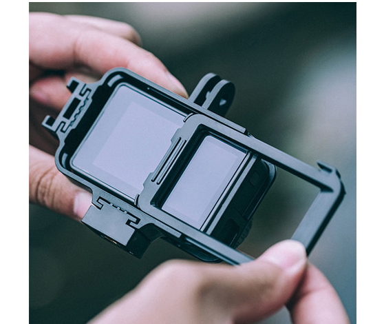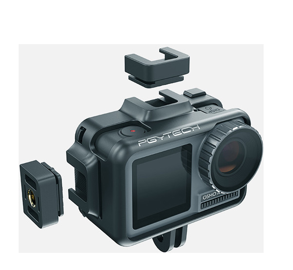 Kryt PGYTECH Camera Cage pro Osmo Action nabízí design, který se perfektně přizpůsobí tvaru kamery, a několik úchytů pro příslušenství, díky kterým můžete připevnit mikrofony, světla a rukojeti, aniž byste ztratili přístup k displeji a ovládacím prvkům kamery.