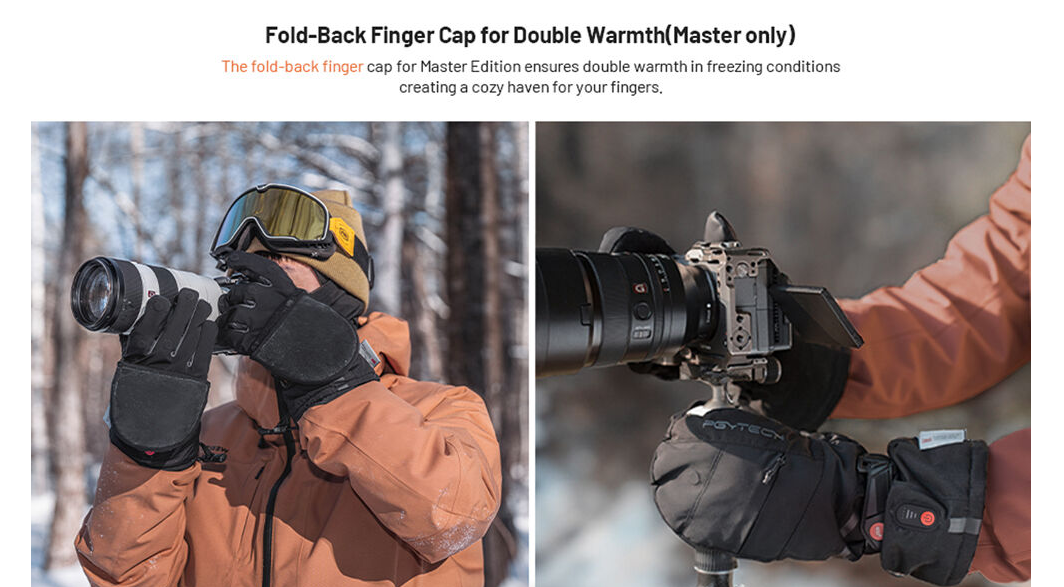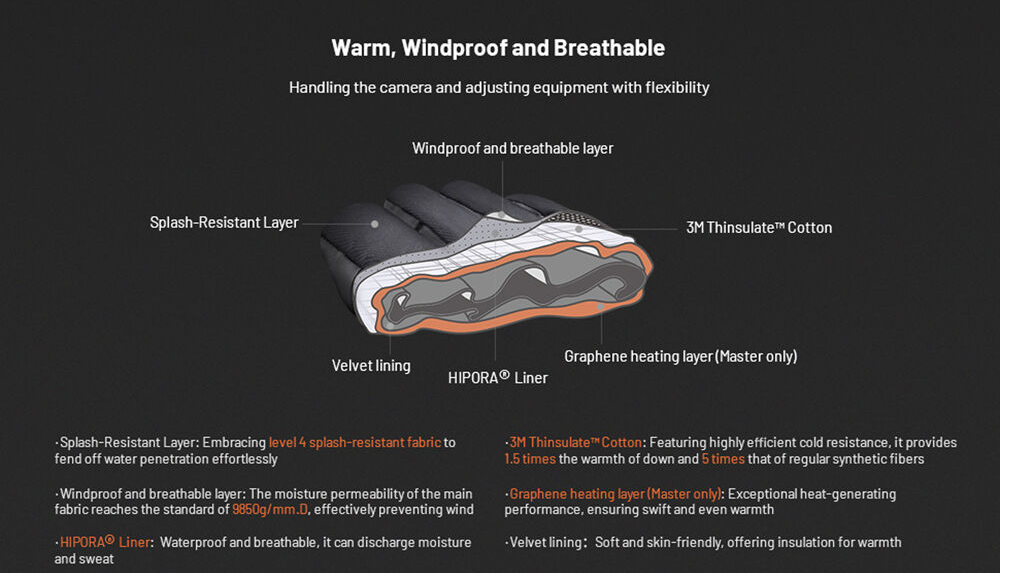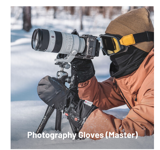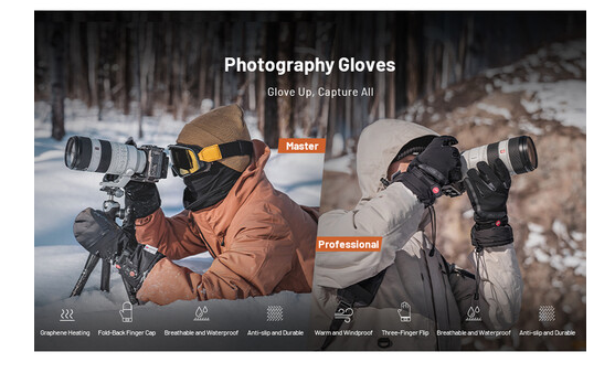 Rukavice kombinují bavlnu 3M Thinsulate, voděodolnou a prodyšnou podšívku HIPORA, větruodolnou vrstvu a látku odolnou proti stříkající vodě, aby chránily vaše ruce před chladem, větrem a vlhkostí. Polstrované kožené dlaně a výplň SBR zlepšují přilnavost a pohodlí, zatímco sametová podšívka dodává měkkost a izolaci. Ohrnuté prsty umožňují snadný přístup pro přesné ovládání fotoaparátu a poutko na zápěstí s přezkou zabraňuje ztrátě rukavic a udržuje je pohromadě. Tyto rukavice jsou ideální pro extrémní teploty od -31 do 32 °F (-35 až 0 °C) a jsou dokonalým společníkem pro venkovní fotografování v zimě.