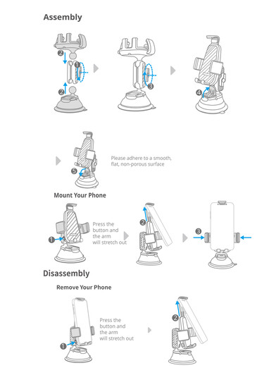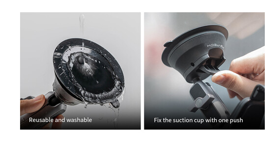 Rychloupínací svěrka s tlačítkem, navržená pro pohodlné používání, umožňuje snadné vložení nebo vyjmutí telefonu, zatímco vestavěný výřez pro port umožňuje připojení nabíjecího nebo datového kabelu během používání. Přísavka je vyrobena z odolné hliníkové slitiny a vyztuženého plastu, je omyvatelná a opakovaně použitelná, což zaručuje dlouhodobou spolehlivost.