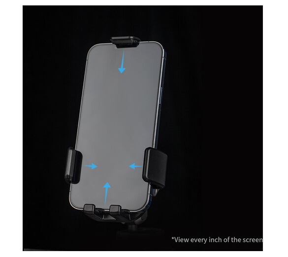 Držák na smartphone s celoplošným obložením a protiskluzovou gumovou výstelkou na zadní straně, ramenech a horní svorkě udržuje vaše zařízení pevně na místě. Integrovaná dvojitá uzamykatelná kulová hlava magic arm umožňuje naklonění o 180° a otočení o 360°, což vám poskytuje přesné ovládání úhlu pro navigaci, nahrávání, videohovory nebo prohlížení obsahu.