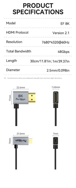 S délkou 1 metr poskytuje tento kabel flexibilitu a zároveň zachovává čistotu a organizovanost nastavení. Jeho odolná konstrukce zajišťuje stabilní signál s minimálním rušením, takže je ideální pro filmaře, fotografy a tvůrce obsahu, kteří vyžadují spolehlivý výkon při práci ve vysokém rozlišení. Ať už pořizujete filmové záběry nebo prohlížíte obsah na externím monitoru, kabel Portkeys 8K HDMI poskytuje nekompromisní kvalitu.