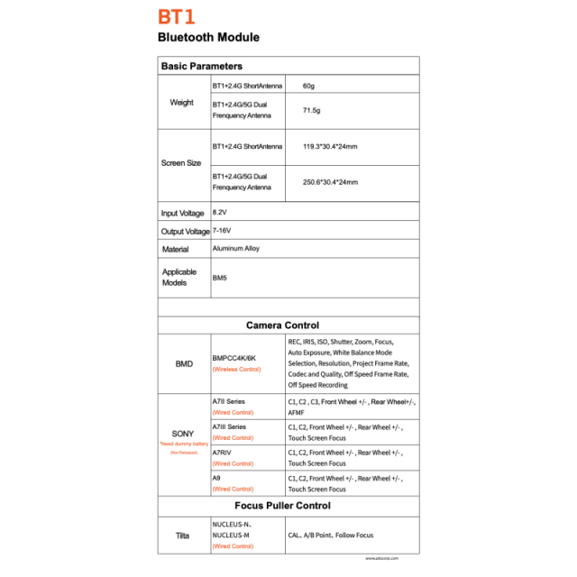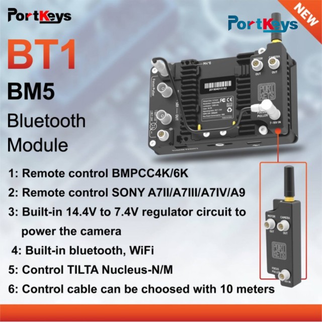 Volitelný Bluetooth modul pro monitory BM5 I a II umožňující dálkové ovládání kamer BMPCC4K/6K (bezdrátově) a Sony A7II / A7III / A7IV (po kabelu). Lze ovládat (dle kamery) např. záznam, clonu, ISO, závěrku, zoom, ostření, auto expozici, vyvážení bílé, nastavení rozlišení/fps/kodeku.